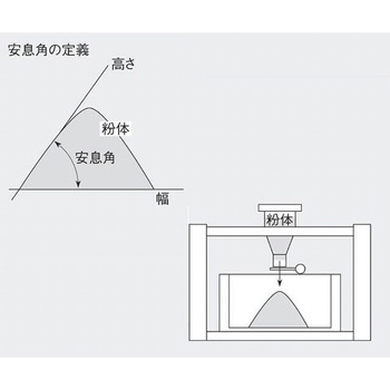 粉体を上方より落下後、下部で堆積した粉末の安息角を分度器で測定します。粉末落下の高さを調節できます。非帯電性の粉末に適しており、簡易測定が可能です。