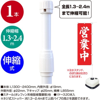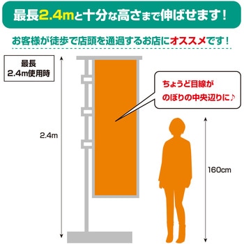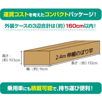 全長1.3~2.4mまで伸縮可能!お客様の最適な位置で調整しお使いいただくことができます。最短は1.3mまで縮小できて、とってもコンパクト!外装ケースの3辺合計は(約)160cm以内で、乗用車にも積載でき、持ち運びにも便利です。回転頭(風車)の構造により、のぼりは風の向きでひるがえります。横棒はパイプの中に収納されています。焼却しても有毒ガスが発生しない樹脂を使用しています。