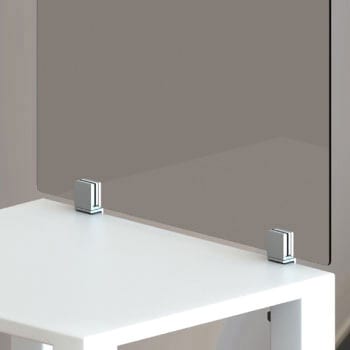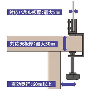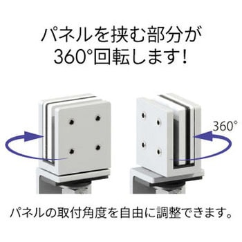 パネル用固定クランプです。後付けで、デスク等にパネルを固定できます。挟みこんで、閉め込むだけの簡単取り付け!アクリル板、デスクトップパネルなど、幅広い分野で使用することが可能です。パネル固定部が360°回転するため、机に「垂直」や「水平」に取付以外に「斜め」でのパネル設置も可能となってます。天板の板厚が50mmまで取り付けできます。エッジに丸みや傾斜のある天板でも使用できます。