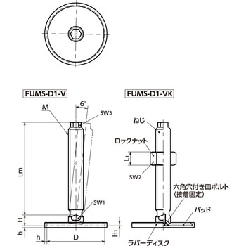 耐久性にすぐれた金属製のレベリングアジャスタ。ねじ・パッドはステンレス製のため、耐蝕性にすぐれています。機器・装置の高さ調整は、ねじ上部の六角部および下部の二面幅を利用してください。パッドは6°まで傾きます。傾斜面での使用に効果的です。機器・装置の滑り止めに効果的なラバーディスクつき。ラバーディスクは耐候性にすぐれたTPE製。紫外線や気温変化のある環境でも劣化しにくい材質です。ラバーディスクは取りはずし可能です。ロックナットの有無が選択できます。