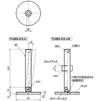 耐久性にすぐれた金属製のレベリングアジャスタ。ねじ・パッドはステンレス製のため、耐蝕性にすぐれています。機器・装置の高さ調整は、ねじ上部の六角穴および下部の二面幅を利用してください。パッドは6°まで傾きます。傾斜面での使用に効果的です。機器・装置の滑り止めに効果的なラバーディスクつき。ラバーディスクはパッドに接着されています。機器・装置への取りつけ・取りはずしや移動時に、ラバーディスクの脱落を防止します。ロックナットの有無が選択できます。