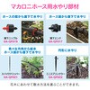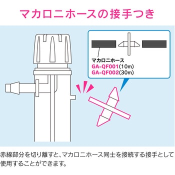 マカロニホース用の散水用スプリンクラー3個入りです。マカロニホースの末端に接続して、植物の根元近くに360°散水できます。ヘッド部を回して流量調節ができ、散水範囲を半径約0.2m~0.4mに変えることができます。スパイク式なので土に差すだけで簡単に固定できます。やさしく水やりができるので、植木鉢やプランターなどの潅水に最適です。マカロニホースは別途GA-QF001(10m)、GA-QF002(30m)をお求めください。抜け防止用のバンドには別途GA-QF009をご使用ください。