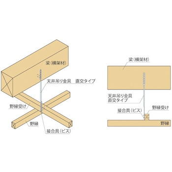 用途横架材と天井材の接合に使用します。横架材と同じ向きに野縁受け材を配置する場合には「平行タイプ」を使用します。横架材と直交する向きに野縁受け材を配置する場合には「直交タイプ」を使用します。