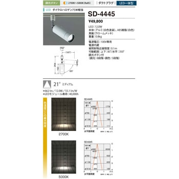 仕様電源内蔵。調光スイッチ付(調光:8段階/調色:5段階)。ミディアム21°。長さ(mm)181材質/仕上本体:アルミ(白色塗装)、ABS樹脂(白色)、真鍮(クロームメッキ)質量(kg)0.8直径(Φmm)60高さ(mm)259タイプLED一体型電圧(V)AC100消費電力(W)12色温度(K)2700~5000取付け方法ダクトタイプエネルギー消費効率(Lm/W)固有:68.5LEDLED 12.0W光束(Lm)(LED)822LED寿命(時間)40000配光角度(°)21調光方式ボリューム・スイッチ可動範囲上下90°/水平350°演色指数(Ra)85近接限度距離(m)被照射物:0.1従来光源ダイクロハロゲン75W相当調色の可否可内容量1個