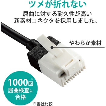 新素材コネクタ採用で通常の使用環境では絶対にツメが折れない!周波数帯域500MHzを保証する10ギガビット・イーサネットに対応。直径わずか3.0mmのスーパースリムケーブルと従来比約40%のショートコネクタを採用したカテゴリー6A準拠のLANケーブル。※1000回の屈曲検査合格(メーカー検証)