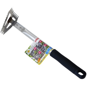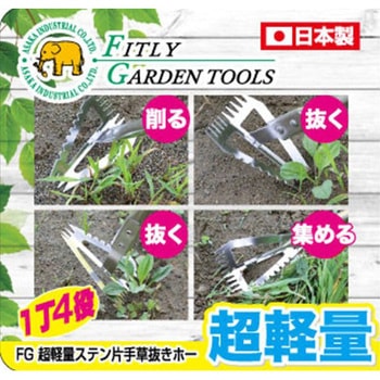柄部にアルミパイプを採用し超軽量化を実現。 先端部(ピンポイントに抜く)、後面部(広範囲に抜く)、刃付け両側面部(土ごと削り取る、草を集める)の1丁4役。 頭部ステンレス製でさびにくい。