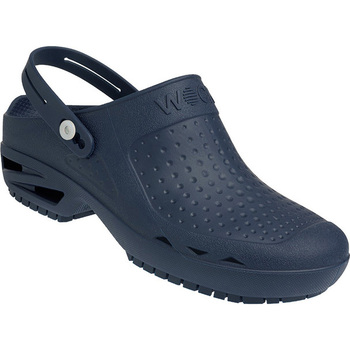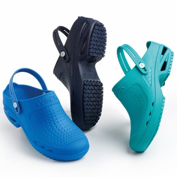 134℃で減菌処理(オートクレープ処理)できます。温水(90℃まで)で丸洗い可能です。素材にレモンの香りが練りこまれており、悪臭を軽減します。滑りにくいソールデザインになっています。使用する素材は悪臭、バクテリアや細菌の繁殖を防ぎます。ヒールストラップ付きです。