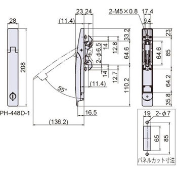 2点止仕様です。上下2箇所の鎌形状の止金で扉を締め込むため、密閉性を高めることができます。扉を閉めると高い密閉性を維持できます。左右兼用型です。ハンドルの閉時、開時の状態を保持できます。側面に施錠状態を示す赤色マークが付いています。他のアウトサイドハンドルと取り付けに互換性があります。 M3ネジ4本で0.8mmの薄板扉に取り付ける事も可能です。
