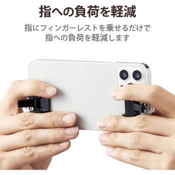 スマートフォン用ゲームの長時間プレイを快適にするフィンガーレスト2個セット品です。スマートフォンの左右に取り付け、フィンガーレストを指の上に乗せるだけで、スマートフォンの重量を無理なく受けとめられます。