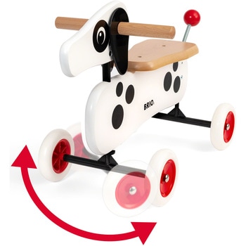 木製のハンドルを握り、なめらかな木の座面に座って、お子様自身が足で進む乗用玩具。おちゃめな尻尾が楽しげに揺れます。屋内専用。組立式。