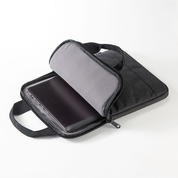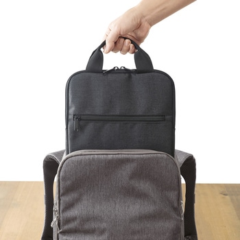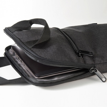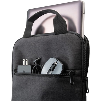 持ち運びや鞄からの出し入れに便利なハンドル付きです。軽くてかさばらないスリムタイプです。フロントポケットにはマウスやACアダプタなどを収納できます。内装はパソコン表面にやさしい柔らかい起毛素材です。型崩れしにくいしっかりしたポリエステル生地を採用しています。