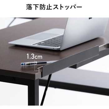 大型の中棚が付属したL字デスクです。W900×D500mmのメイン天板にW300×D1050mmのサブ天板を組み合わせることで、メインの作業スペースとしてはW1200×D500mmを使うことができます。W300mm×D1050mmの天板の下には、D250mmの中棚が付属し、余裕の収納スペースがあります。メイン天板には落下防止金具が付属します。クランプ式のモニターアームを取り付けることが可能です。(落下防止金具を取り外した場合)