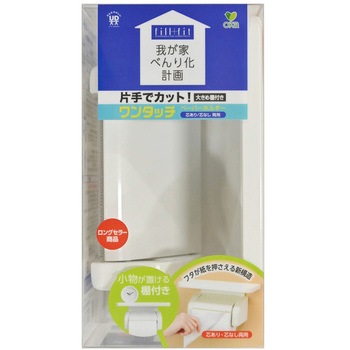 フタが紙を押さえる構造により片手でトイレットペーパーが簡単にカットできます。イレットペーパーの交換は、簡単に取り替えられるよう下からペーパーを押し込むワンタッチ方式。小物等を置ける棚付き。