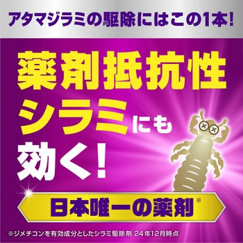 卵まで効くから再発生を防止。ヘアオイル状のさらっとした使用感です。ピレスロイド系殺虫成分不使用、有効成分ジメチコンのシラミ駆除剤です。