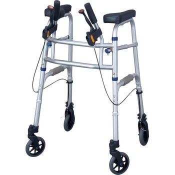 全幅60cm、コンパクトサイズの馬蹄型歩行器。縦型ブレーキハンドル、パーキングブレーキ付き。重量5.8kgと軽量で薄型に折りたたみができるので、収納・持ち運びに便利。室内専用。施設やご家庭内でのご使用におすすめ。