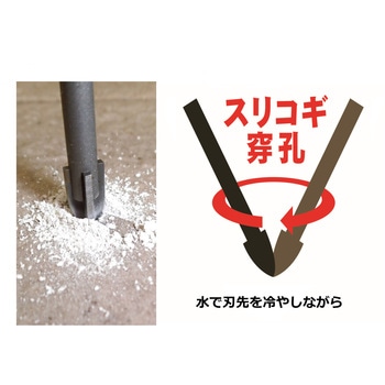 硬い磁器タイルでも驚きの貫通力。長寿命を実現。穿孔時に先端が逃げにくくすべりにくい。プロの満足度を追求したブランドGranGear(グランギア)商品。先端のクロス刃が硬い磁器タイルもきれいに穴あけ。サイド刃を使いスリコギ穿孔(刃先を水で冷やしながら)をすることで驚異の耐久性を実現。おすすめ穿孔方法:貫通直前にスリコギ穿孔からストレート穿孔に変える(穴あけ径を広げすぎない)。連続穿孔時約10秒に1回程度刃先を水で冷やす。