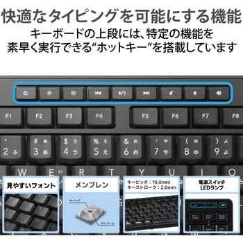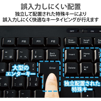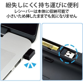 付属品動作確認用単4形アルカリ乾電池×1サイズテンキーレス質量(g)【キーボード本体】約350※電池含まず、【レシーバー】約1電源【キーボード本体】単4形アルカリ乾電池・単4形マンガン乾電池・単4形ニッケル水素2次電池のいずれか1本対応OSWindows 11、Windows 10、Windows 8.1、 macOS Big sur (11)、 Chrome OS ※各OSの最新バージョンへのアップデートや、サービスパックのインストールが必要になる場合があります。 ※最新情報は対応表をご確認ください。コネクタ形状USB-Aオス対応機種USBポートを装備したWindows OS、macOS、Chrome OS搭載機外形寸法(幅W×奥行D×高さH)(mm)【キーボード本体】361.6×139.8×26.3(スタンド含まず)、361.6×139.8×34.8(スタンド時)、【レシーバー】19.0×14.5×6.0インターフェースUSB保証期間1年間電波到達距離(m)磁性体(鉄の机など)の上で使用する場合:約3、非磁性体(木の机など)の上で使用する場合:約10※メーカー環境でのテスト値であり保証値ではありません。電池使用可能期間アルカリ乾電池使用時の目安 1.5年 ※1日8時間のパソコン操作を想定ホットキー数9キー電波周波数2.4GHz帯内容量1個