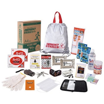 非常用持出袋、アルミブランケット、防災の心得、ダイナモLEDライト、IDホイッスル&カラビナリング、マスク、軍手、ウェットティッシュ、給水袋3L、綿棒&バンソウコウ、8徳ナイフ、FMラジオ、カイロ、5年保存水500mL、レインコート、カンパン100g、携帯用トイレ