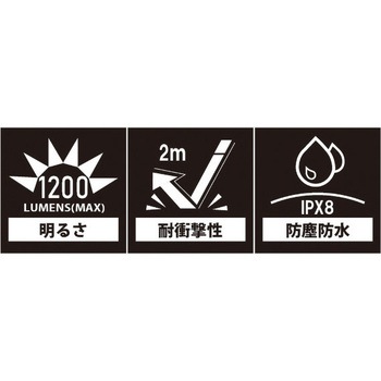 MAX1200ルーメン出力のハイパフォーマンストーチライト。赤・緑ランプ付フラッシュライトタイプ。赤と緑の点灯&ストロボモード搭載で災害時のSOS信号としても活躍。PCレンズ。ポケットクリップ付き。充電インジケータ付き(赤/要充電-緑/充電完了)。