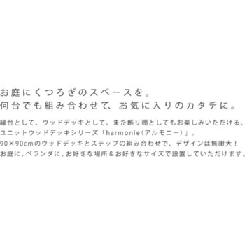 お庭にくつろぎのスペースを。何台でも組み合わせて、お気に入りのカタチに。縁台として、ウッドデッキとして、また飾り棚としてもお楽しみいただける、ユニットウッドデッキシリーズ「harmonie(アルモニー)」。90×90cmのウッドデッキとステップの組み合わせで、デザインは無限大!お庭に、ベランダに、お好きな場所&お好きなサイズで設置していただけます。