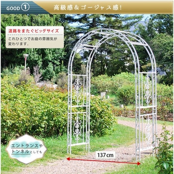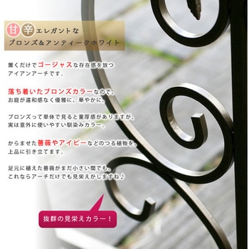 【甘辛エレガントなブロンズカラー&アンティークホワイト】置くだけでゴージャスな存在感を放つアイアンアーチです。落ち着いたブロンズカラーなので、お庭が違和感なく優雅に、華やかに。ブロンズって単体で見ると重厚感がありますが、実は意外に使いやすい馴染みカラー。からませた薔薇やアイビーなどのつる植物を上品に引き立てます。足元に植えた薔薇がまだ小さい間でも、これならアーチだけでも見栄えがしますね♪