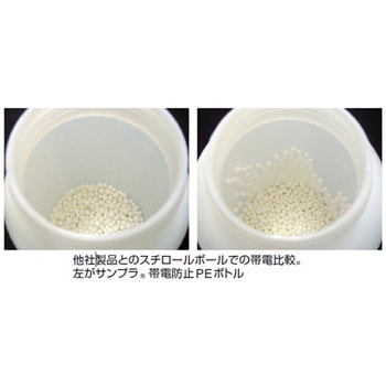 広口タイプ通常のポリ瓶に”帯電防止”という新たな機能を持たせました。パーティクル付着の防止、内容物の絶縁破壊の危険性防止など、ポリ瓶では意外と無かった機能が付加されました。特殊なポリマー型帯電防止剤で半永続的な帯電防止効果が期待できます。