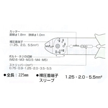 ):1.25・2.0・5.5●全長(mm):225●材質:特殊鋼・PVC(塩化ビニル樹脂)●ケーブルストリッパー能力:0.75・0.9・1.25・2.0・3.5・5.5mm