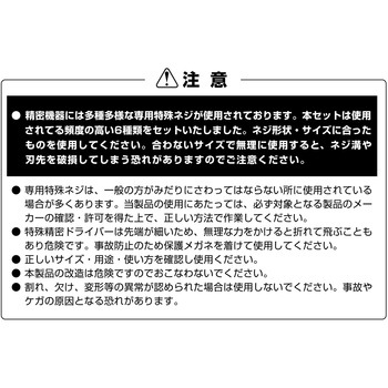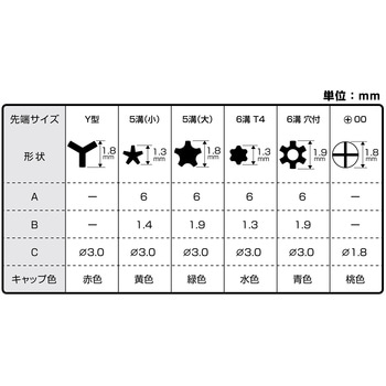 ●セット点数:6本●全長:113mm●軸長:20mm●先端:Y型:1.85溝:1.3、1.8mm6溝:1.3、1.9mm+00