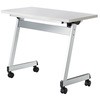 W600mm(1人用)の超コンパクト設計です。レバー操作により天板フラップが可能です。キャスターで移動させ、横に重ねて収納ができます。天板は耐久性と耐熱性に優れたメラミン化粧板で、エッジ部は一体感のあるPVC樹脂エッジ巻仕様です。書類やファイルなどの収納に便利な棚付きです。