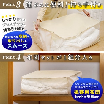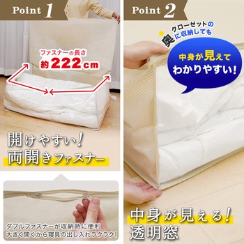 バルサン!収納物を守るトリプルパワー不織布。不織布の表面にダニよけ/防虫/抗菌・抗カビ加工を施しています。※ヒョウダニに対する検証試験、カツオブシムシ・イカ類に対する検証試験・すべての菌やカビに効果があるというわけではありません。通気性のある不織布製の収納袋です。効果期間目安は開封後約6カ月です。※使用環境により異なります。収納物が確認できる透明窓付き開けやすい両開きファスナーです。