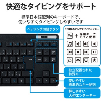 接続方式Bluetooth(R)無線方式キー方式メンブレンキー配列92キー(日本語配列) ※iOS、iPadOSではかな入力に対応しておりません。キーピッチ(mm)19対応機種Bluetooth(R)HOGPプロファイルに対応したWindows OS、Android OS、macOS、iOS、iPadOS搭載機対応OSWindows 10、Windows 8.1、macOS Catalina(10.15)、 macOS Big sur (11.0)、 Android10, 11、iOS14、iPad OS14 ※各OSの最新バージョンへのアップデートや、サービスパックのインストールが必要になる場合があります。※最新情報は対応表をご確認ください。接続台数3台付属品動作確認用単4形アルカリ乾電池×1通信方式GFSK方式電波到達距離(m)磁性体(鉄の机など)の上で使用する場合:約3、非磁性体(木の机など)の上で使用する場合:約10※メーカー環境でのテスト値であり保証値ではありません。保証期間6カ月間色ブラック質量(g)【キーボード本体】約455※電池含まず電源【キーボード本体】単4形アルカリ乾電池・単4形マンガン乾電池・単4形ニッケル水素2次電池のいずれか1本適合規格Bluetooth 5.0 Class2外形寸法(幅W×奥行D×高さH)(mm)【キーボード本体】360.6×142.5×25.6(スタンド含まず)、360.6×142.5×34.1(スタンド時)キーストローク(mm)2.5電池使用可能期間アルカリ乾電池使用時の目安 約8カ月 ※1日8時間のパソコン操作を想定ホットキー数13キー電波周波数2.4GHz帯対応プロファイルHOGP(HID Over GATT Profile)内容量1個