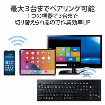 接続方式Bluetooth(R)無線方式キー方式メンブレンキー配列109キー(日本語配列)キーピッチ(mm)19キーストローク(mm)2対応機種Bluetooth(R)HOGPプロファイルに対応したWindows OS、macOS、Chrome OS、iOS、iPadOS、Android OS搭載機対応OSWindows 11、Windows 10、macOS Monterey (12)、 Android11、iOS15、iPad OS15、Chrome OS ※各OSの最新バージョンへのアップデートや、サービスパックのインストールが必要になる場合があります。 ※最新情報は対応表をご確認ください。接続台数3台通信方式GFSK方式電波周波数2.4GHz帯電波到達距離(m)磁性体(鉄の机など)の上で使用する場合:約3、非磁性体(木の机など)の上で使用する場合:約10※メーカー環境でのテスト値であり保証値ではありません。ホットキー数13キー電源【キーボード本体】単4形アルカリ乾電池・単4形マンガン乾電池・単4形ニッケル水素2次電池のいずれか1本外形寸法(幅W×奥行D×高さH)(mm)【キーボード本体】436.6×148.7×26.7(スタンド含まず)、436.6×148.7×34.7(スタンド時)質量(g)【キーボード本体】約492※電池含まず付属品動作確認用単4形アルカリ乾電池×1保証期間1年間対応プロファイルHOGP(HID Over GATT Profile)適合規格Bluetooth 5.2 Class2電池使用可能期間アルカリ乾電池使用時の目安 1年 ※1日8時間のパソコン操作を想定内容量1個