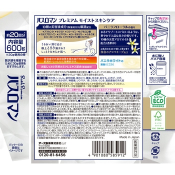 香りバニラフローラルの香り湯の色バニラホワイトの湯色(にごり)寸法(mm)110×156×70成分【有効成分】乾燥硫酸Na、炭酸水素Na【その他の成分】酸化Ti、無水ケイ酸、POE(300)POP(55)、香料、スクワラン、L-グルタミン酸Na、カモミラエキス-1(カミツレエキス)、プラセンタエキス-1、ヒアルロン酸Na-2、水解カゼインNa(ミルクプロテイン)、シア脂、ローヤルゼリーエキス、シルク末、水解コラーゲン末、ステアロイルフィトスフィンゴシン(セラミド)、ローズヒップ油、グリチルリチン酸2K、天然ビタミンE、ビタミンE、ビタミンCジパルミテート、エタノール、BG、フェノキシエタノール、パラベン、乾燥硫酸Na、ステアロイルグルタミン酸Na、無水ピロリン酸Na、ベントナイト、ステアリン酸PEG、石けん用素地、ケイ酸Ca容量600g区分医薬部外品品名バスロマンBP-3シリーズバスロマン寸法(幅W×高さH×奥行D)(mm)110×156×70効能荒れ性、しっしん、疲労回復、肩のこり、腰痛、冷え症、あせも、にきび、ひび、しもやけ、あかぎれ、神経痛、リウマチ、痔、うちみ、くじき、産前産後の冷え症使用量お風呂のお湯(200L)に20gから30gの割合でよくかき混ぜながら、溶かしてください。キャップで計量できます。(20g:目盛線1杯/30g:目盛線1.5杯)医薬品医療機器等法医薬部外品FSC認証番号ミックス・C081641内容量1個(600g)