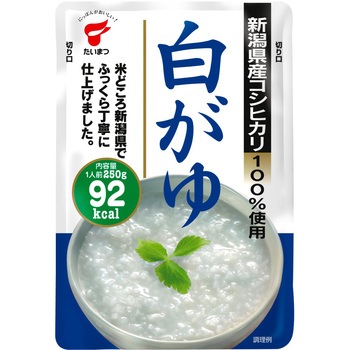 たいまつ食品の白がゆは新潟県産コシヒカリを100%使用した、風味豊かなおかゆです。