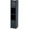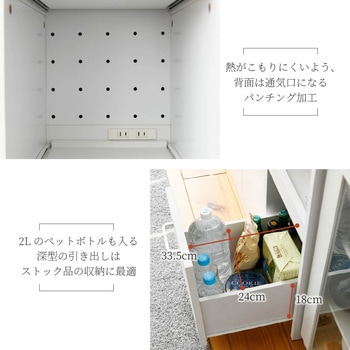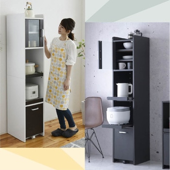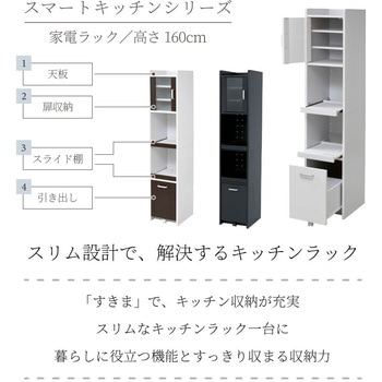 隙間タイプでスリム設計のキッチン収納。高さ違い3タイプのシリーズ。高さ160タイプは、一人暮らしサイズの冷蔵庫横にもファミリーでのキッチンでも活用していただけるオールマイティなサイズ。家電が収納できる、スライドテーブル2つに加えて、食器類の収納に便利な扉収納付き。扉の開く向きはお好みで設定可能です。ペットボトルも収納可能な深めの引出しもあります。
