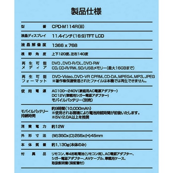 用途ポータブルDVDプレーヤー、DVDプレーヤーとして。車載用、屋外に。対応メディアDVD、DVD-R、DVD-RDL、DVD-RW、CD、CD-R、CD-RW、SD、USBメモリー(最大16GBまで)ディスプレイ11.4インチ(16:9)寸法(幅W×奥行D×高さH)(cm)32×22×4質量(kg)1.02電源(V)C100-240(家庭用ACアダプター)、DC12(車載用シガー電源アダプター)、モバイルバッテリー(別売)消費電力(W)約12解像度1366×768視野角上下120度、左右140度対応フォーマットDVD-Video、DVD-VR、CPRM、CD-DA、MPEG4、MP3、JPEGセット内容本体、リモコン、リモコン用電池(単4形乾電池×2本)、AC電源アダプター、シガー電源アダプター、AVケーブル、車載用ケース、取扱説明書保証期間1年色ブラック内容量1台