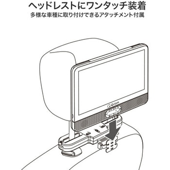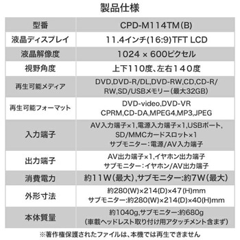 用途レジャー、ドライブ、アウトドア、長距離移動のおともに。ポータブルDVDプレーヤー ヘッドレストモニター ヘッドレストツインDVDプレーヤー。映画 AV機器 ディスプレイ。対応メディアDVD、DVD-R/DL、DVD-RW、CD、CD-R/RW、SD/USBメモリー(最大32GB まで)液晶パネル11.4インチワイド(16:9)TFT LCD寸法(幅W×奥行D×高さH)(cm)DVDモニター:28×4.7×21.4、サブモニター:28×4×21.4質量(kg)DVDモニター1.04、サブモニター0.28電源(V)AC100-240(50/60Hz)/家庭用ACアダプター、DC12(車載用シガー電源アダプター)消費電力(W)DVDモニター11、サブモニター7解像度液晶:1024×600ピクセル視野角上下110度、左右140度入力端子【DVD プレーヤー】AV入力端子、電源入力端子、USBポート、SD/MMCカードスロット、【サブモニター】電源/AV入力端子出力端子【DVD プレーヤー】電源/AV出力端子、イヤホン出力端子、【サブモニター】イヤホン出力端子スピーカー2CH ステレオ(1.5W×2)対応フォーマットDVD-Video、DVD-VR CPRM、CD-DA、MPEG4、MP3、JPEG付属品DVDプレーヤー本体×1、サブモニター×1、リモコン×1、単4形乾電池(リモコン初期動作確認用)×2、家庭用ACアダプター(AC1OOV-240V)×1、カーアダプター【車載用シガー電源アダプター】(DC12V対応)×1、サブモニター接続用ケーブル×1、車載ヘッドレスト取付け用アタッチメント×2(スペーサー×1組(2枚)取り付け済み)、アタッチメント用スペーサー5組(10枚)×2、ステント(アタッチメント用DVD プレーヤー本体取り付けホルダー)×2、取扱説明書(保証書付き)×1保証期間1年色ブラック内容量1台
