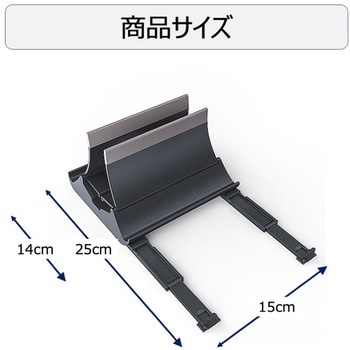 ノートパソコンやタブレットの角度を調整するためのスタンドです。縦置きの場合、自重で、デバイスの厚さに合わせて自動的にはさみます。ノートパソコンやタブレット、書類などのにも縦置き収納が可能です。厚みは約3.5cmまで対応します。