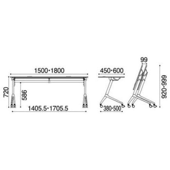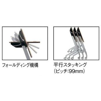 スタッキングピッチ99mmを実現したアルミダイキャスト脚のフォールディングテーブル。天板開閉時に使用する操作レバーはしっかり握れる大きめサイズを採用し、アジャスターにより高さ調節が可能。キャスターのストッパーは操作がしやすい大きめのレバーを採用。オプションで幕板、棚、配線トレーを設置できます。