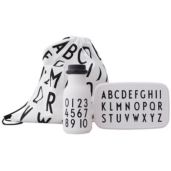 ウォーターボトル、ランチボックス、ナップサックの3点セット。白と黒のシンプルなデザインでランチタイムに大活躍。