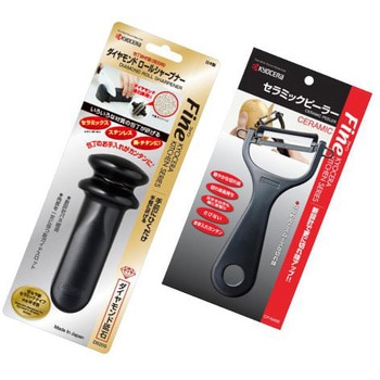 包丁研ぎ器<両刃用> ※京セラ製セラミックナイフ・ステンレス・鋼・チタン製ナイフ対応ダイヤモンド砥石を採用! セラミックナイフ※も研げる!※京セラ製に限るガイドスロットに包丁を入れて力を入れ過ぎずに手前に引くだけで簡単に研げる手作業で板砥石を使って研ぐのと同様に、縦方向に研ぐので、切れ味が回復し長続きするピーラー:軽やかな切れ味。セラミックス刃のピーラーだから、刃の磨耗が少なく、シャープな切れ味でお使いいただけます。セラミック刃なのでサビずに、金気を出さないので、野菜やフルーツに金気を移しません。台所用漂白剤で、つけおき漂白除菌もご使用いただけます。ななめ刃でスムーズな切れ味が特徴。便利な芽取り付きで使いやすいフォルムのピーラーです。