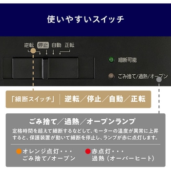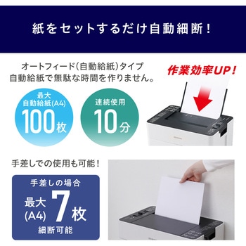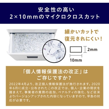 これまで使用していた業務用シュレッダーの故障により、更新機材として購入。 価格、大きさ、裁断後の紙寸法等を比べ、総合的に優と判断しての購入でした。 良い買い物ができたように思います。