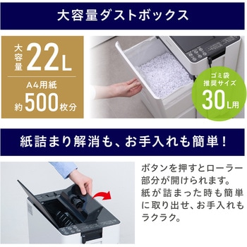 コピー用紙を自動細断可能なオートフィードシュレッダーです。2×10mmのマイクロクロスカットで細かく細断、個人情報をしっかり処理します。トレーを開けて紙を投入口にセットするだけで自動で細断、書類処理にかかる時間を短縮します。本体とダストボックスの前後の組み合わせを変えることができるので、お好みの向きで使用でき、省スペース化にも繋がります。移動に便利なキャスター付きです。グリーン購入法適合商品です。