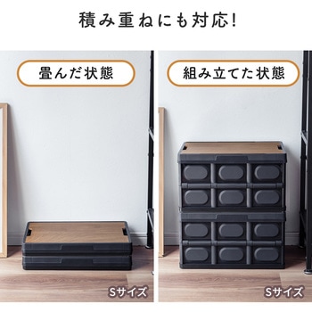 小さく折りたためる樹脂製コンテナです。木製の蓋が付いており、屋内でサイドテーブルにしたり、屋外でアウトドアのテーブルにすることができます。積んだり、並べたり、自由に組み合わせが出来ます。折り畳み時は高さ65mmになり、蓋を付けたまま重ねて積み重ねることができます。約55リットルの収納容量です。