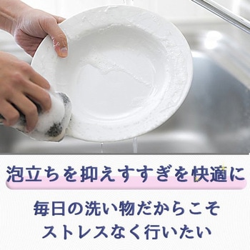 洗浄時の泡立ちを抑え、水ですすぎやすくなっています。また、フローラルフルーティの香り成分を配合しています。フローラルの香りは洗い物時のストレスを軽減し、洗い物をしやすくする環境を作り出してくれます。泡立ちを抑え、すすぎ効果アップ。保湿成分配合で手荒れを防止。