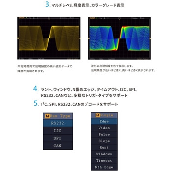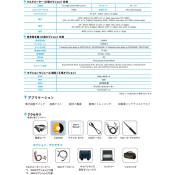 【豊富なオプションと拡張性】25MHz波形発生器、マルチメーター、WiFiモジュール、VGA出力、リチウムイオンバッテリーなど多彩なオプションに対応。プロトコル解析(I2C、SPI、RS232、CAN)にも対応し、組込み開発や通信波形解析に最適。可搬性に優れたモバイルテスターとして現場でも活用可能です。