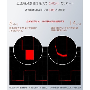 【波形観測】8ビットで10Mの長いレコード長で長時間波形も確実にキャプチャでき、微小な信号変化から複雑な波形解析まで幅広く対応します。VDS6102Aモデルは最大14ビット分解能に対応し、従来の8ビットに比べてより滑らかで詳細な波形観測が可能。10Mの長いレコード長で長時間波形も確実にキャプチャでき、微小な信号変化から複雑な波形解析まで幅広く対応します。