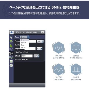 【信号発生器を標準搭載】0.1Hz~5MHzの正弦波をはじめ、方形波、ランプ波、パルス波の出力に対応した1chファンクションジェネレータを内蔵。外部機器がなくても波形生成と観測が1台で完結し、基板の検証や教育用途に最適。省スペース・低コストで効率的な試験環境を実現します。