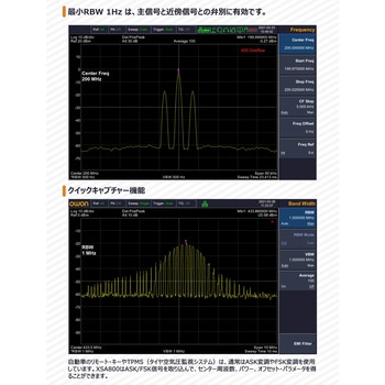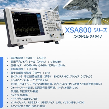 【高性能・幅広い測定範囲】9kHz~1.5GHzの広帯域(モデルにより異なる)をカバーし、最小1Hzの分解能帯域幅(RBW)で細かい信号まで正確に検出。表示平均ノイズレベルは-160dBm、位相ノイズ-80dBc/Hzと低ノイズ設計で、小信号測定や高精度テストに最適です。これにより、通信機器や電子回路の微弱な信号解析を安心して行えます。
