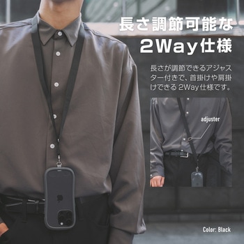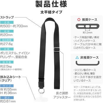 端末やケースを選ばず装着できる多機能ショルダーストラップ/付属の挟み込みシートで、ケースにストラップホールが無くても装着可能/幅広の平紐で首や肩が痛くなりにくい/ビジネスシーンでも使いやすいシンプルデザイン/長さ調整で首掛けor肩掛けが可能な2WAY仕様